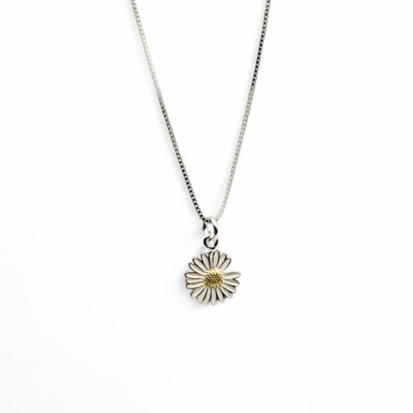 This charming sterling silver necklace features a delicate daisy pendant, beautifully adorned with enamel inlay. The vibrant enamel adds a pop of color to the simple yet elegant design, bringing the daisy to life with its fresh, floral appeal. Suspended from a fine silver chain, this necklace is perfect for adding a touch of nature inspired beauty to any outfit, whether worn casually or for a more dressed up occasion. A timeless piece that celebrates simplicity and charm.