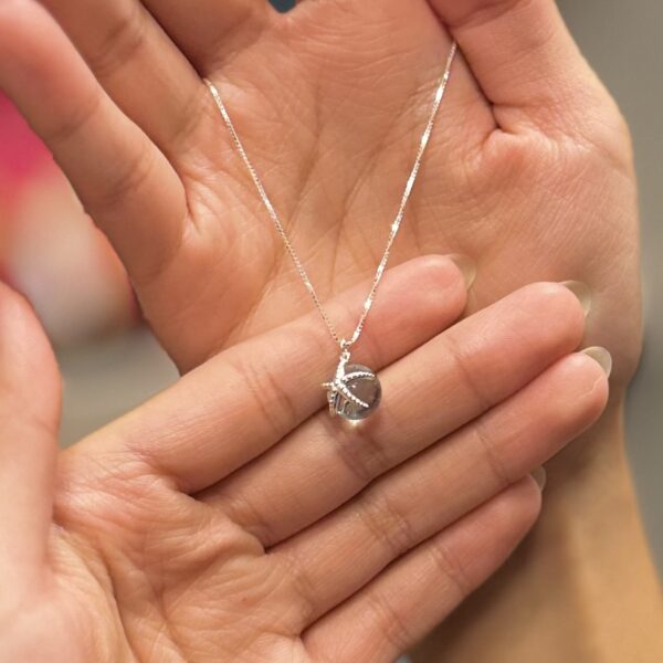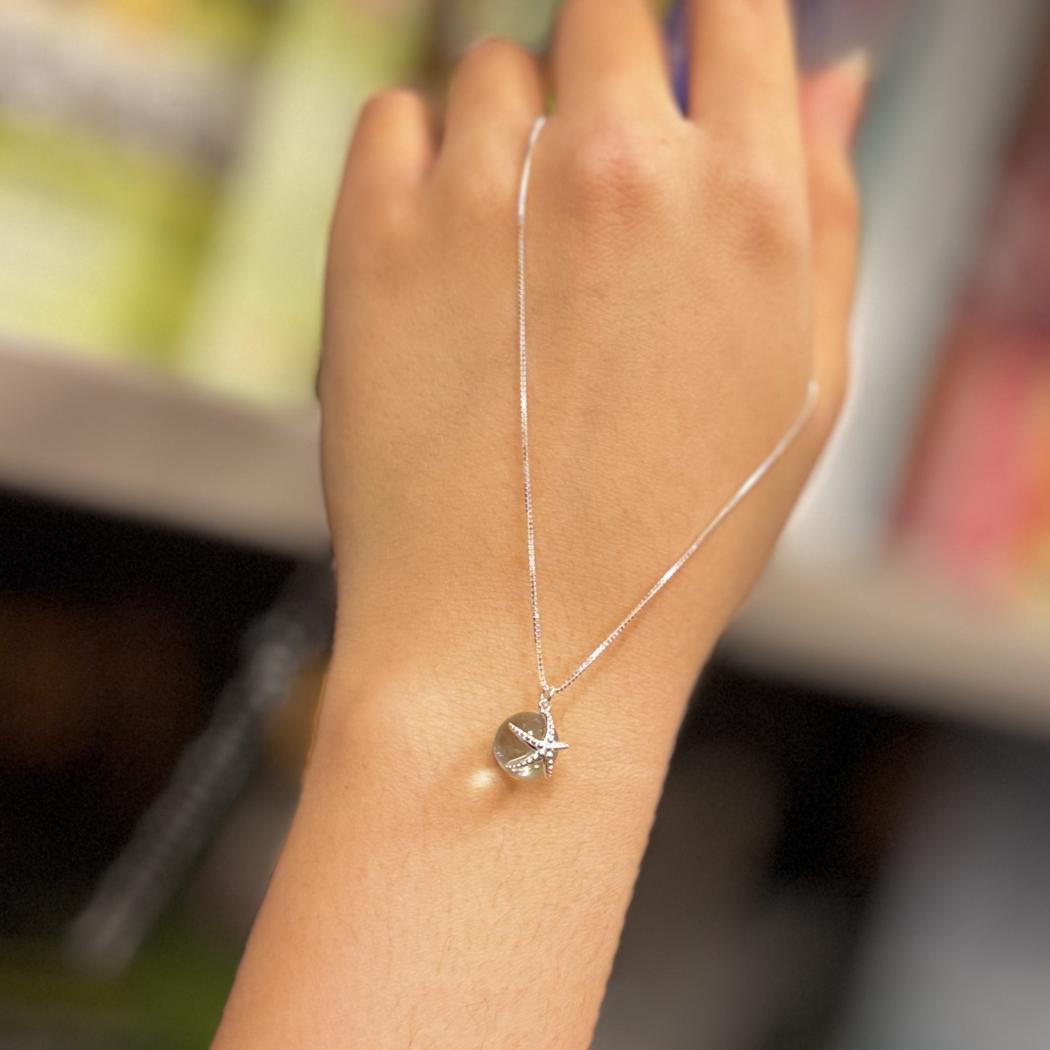 Channel coastal calm with this dainty sterling silver necklace featuring a tiny starfish gently resting on a shimmering blue glass bead. The smooth, ocean-hued glass captures the light like sunlit waves, while the finely detailed starfish adds a touch of seaside charm and wanderlust.
