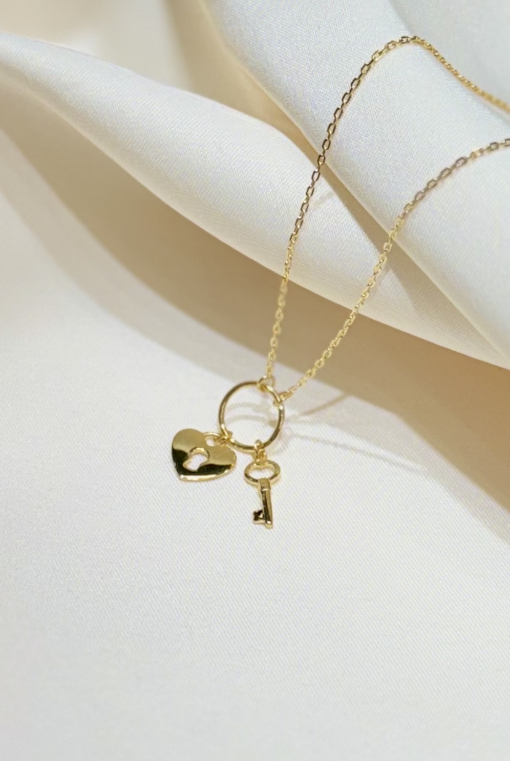 Unlock a little everyday magic with this romantic dual charm necklace. Crafted in sterling silver and finished with a warm 14K gold plating, it features a delicate key charm paired with a sweet heart charm designed with a tiny keyhole.