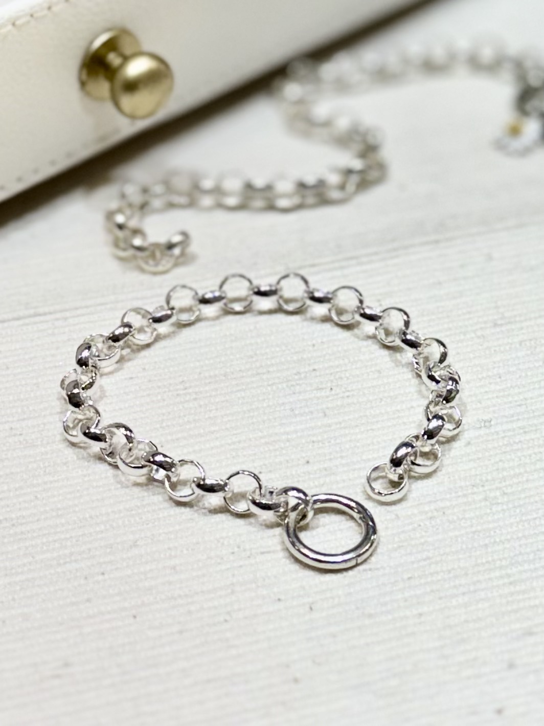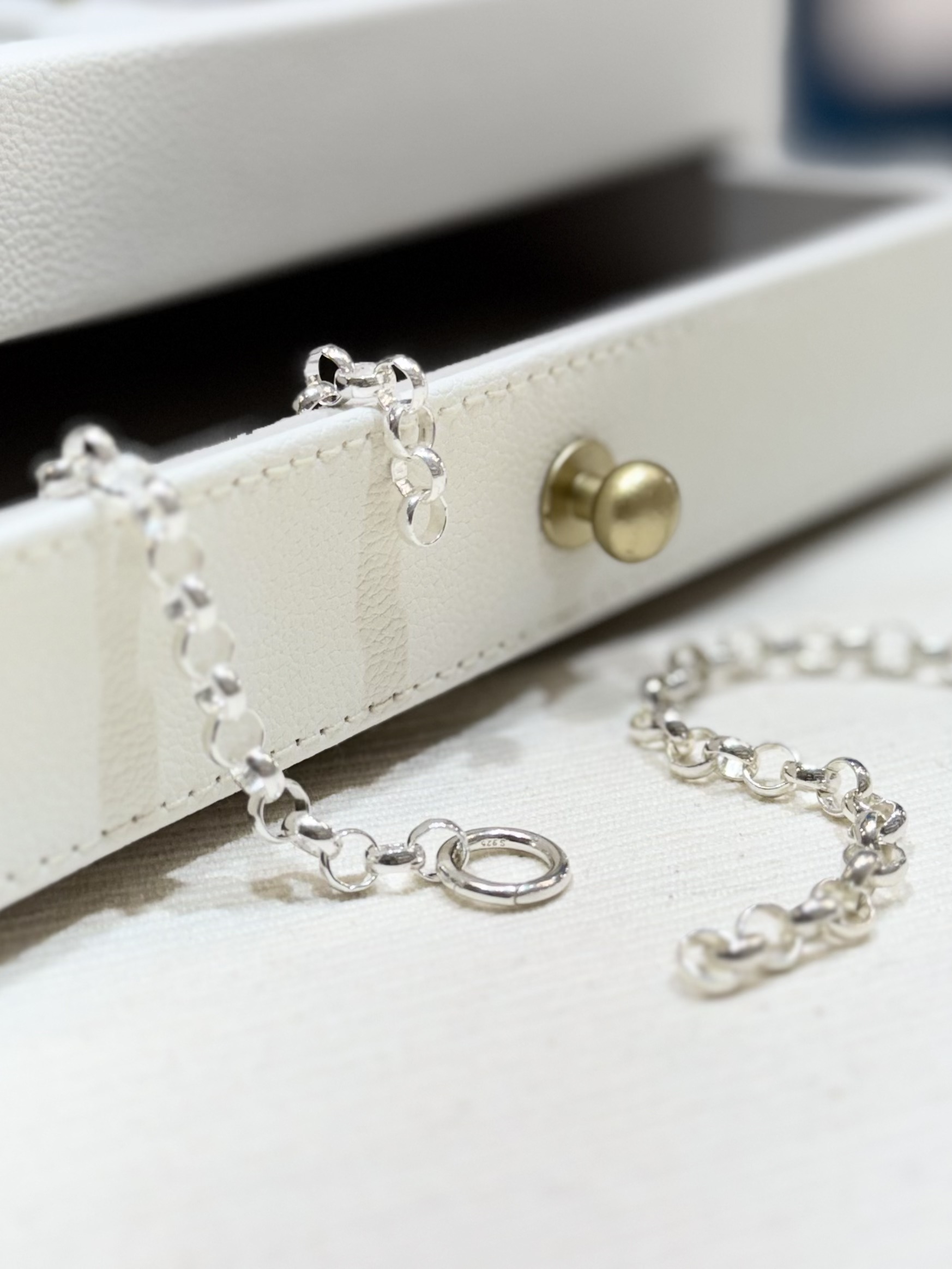 This sterling silver rolo chain features a classic round clasp designed for both style and function. The secure clasp allows for easy attachment and interchange of charms, making it the perfect base for creating your own personalized jewellery look. Elegant and versatile, it’s a timeless piece that complements any charm collection or shines beautifully on its own.