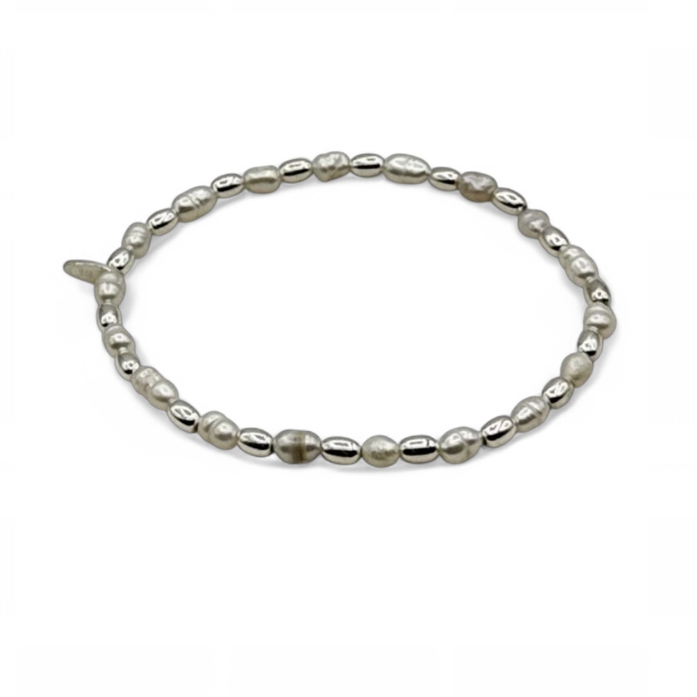 Delicate yet versatile, this stretchable and stackable bracelet features a harmonious blend of sterling silver rice shaped beads and lustrous freshwater pearl beads. The sleek, elongated bead design creates a refined, modern look, while the natural beauty of the pearls adds a touch of timeless elegance.