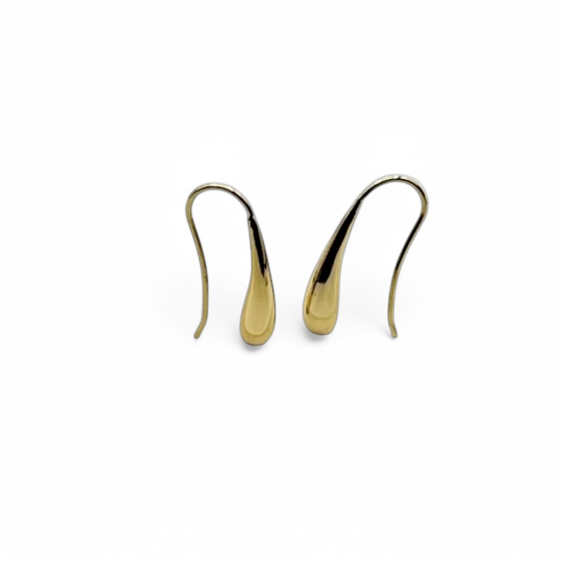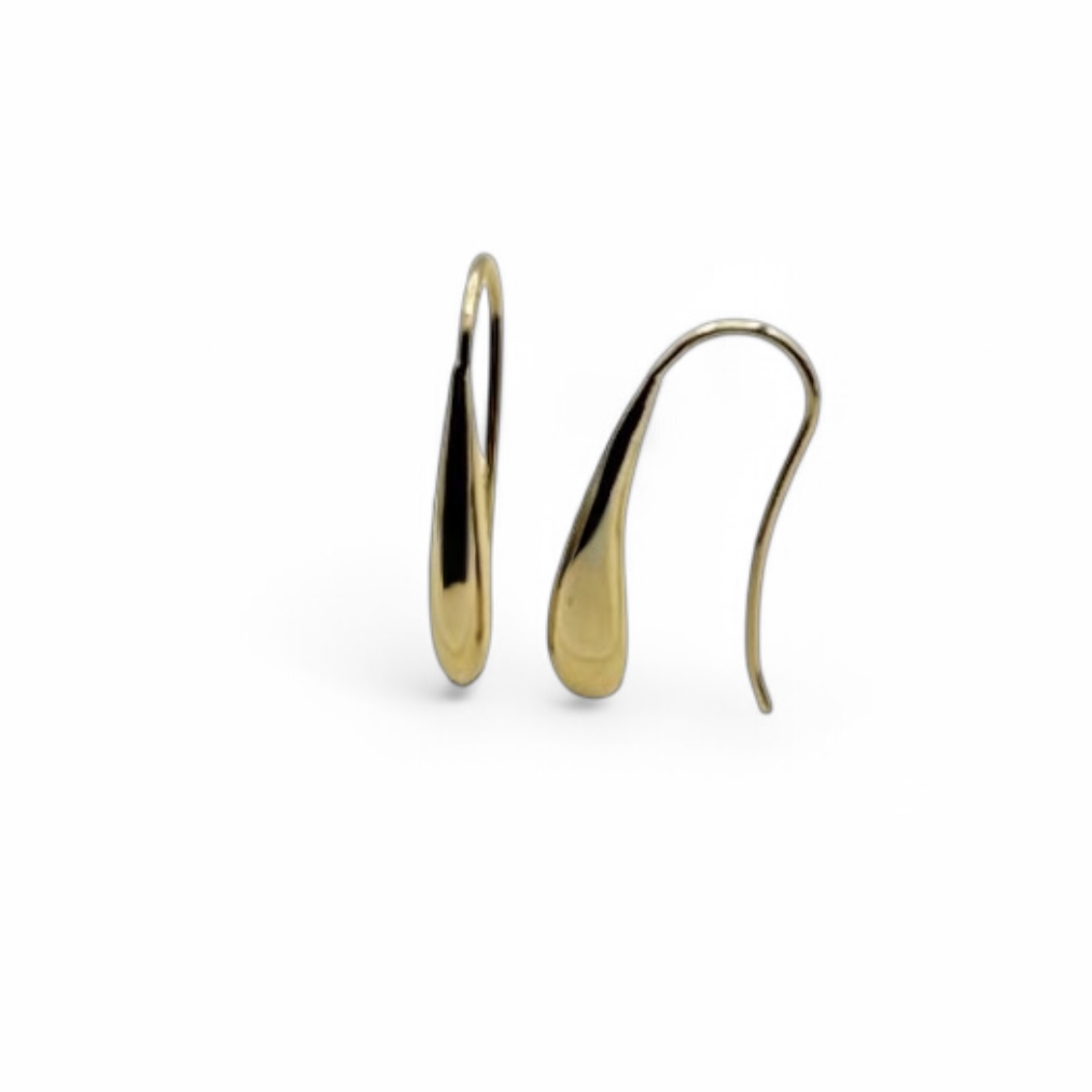 Inspired by the delicate beauty of raindrops, these dangly earrings blend elegance with modern sophistication. Crafted from sterling silver and plated in 14K gold, each earring features a smooth, fluid raindrop design that shimmers with every movement.