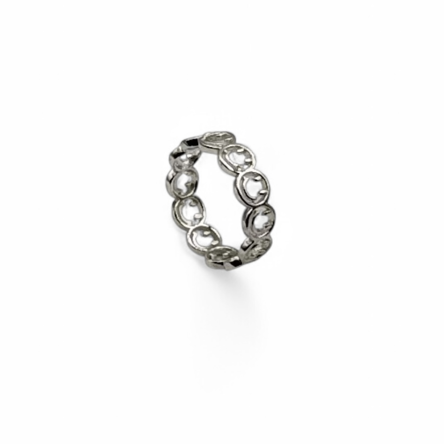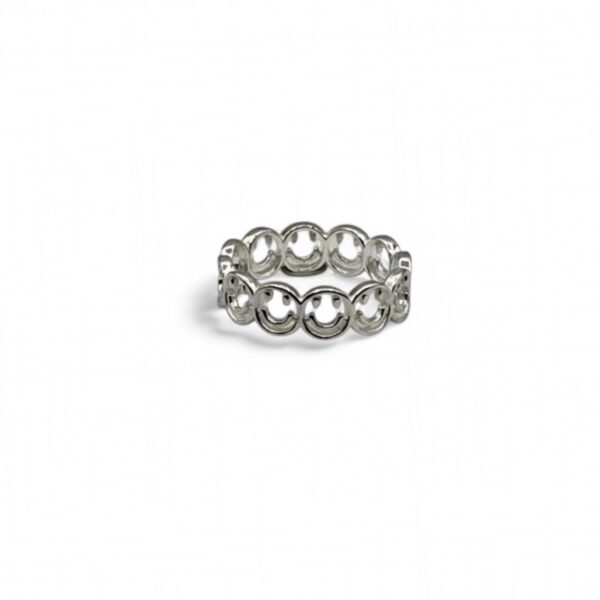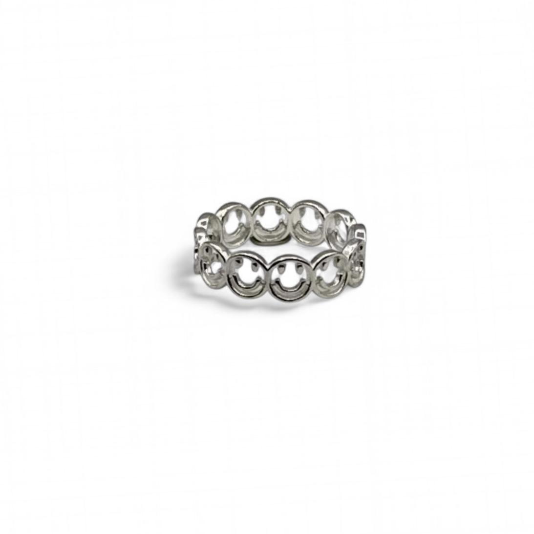 Playful and stylish, this sterling silver ring features a series of interlinked happy faces, creating a fun and uplifting design. Each smiling face is seamlessly connected, symbolizing positivity, joy, and togetherness.