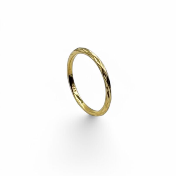 Timeless and chic, this slim faceted ring is crafted from sterling silver and plated with 14K gold, creating a refined and modern look. The faceted design adds subtle texture and dimension, allowing the ring to catch the light beautifully with every movement. The slim band offers a delicate yet striking silhouette, perfect for stacking or wearing alone as a minimalist statement.