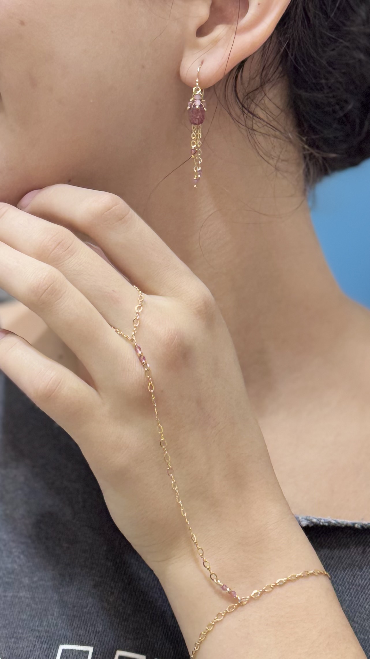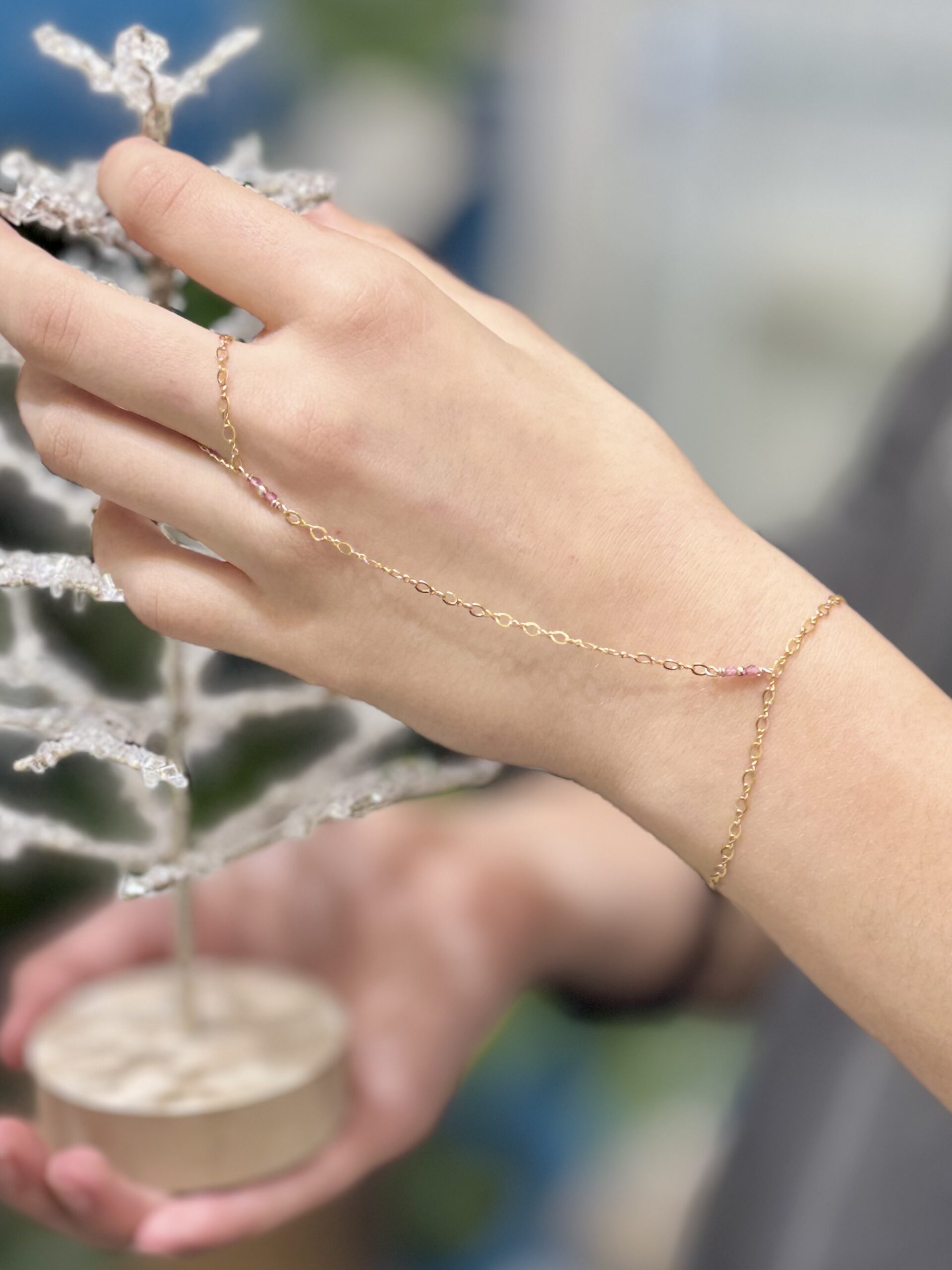 This handmade 14K gold filled hand chain shimmers with dainty pink tourmaline beads. Each one catching the light with a rosy glow. Designed to drape gracefully across your hand, it adds the prettiest touch of sparkle to every gesture.