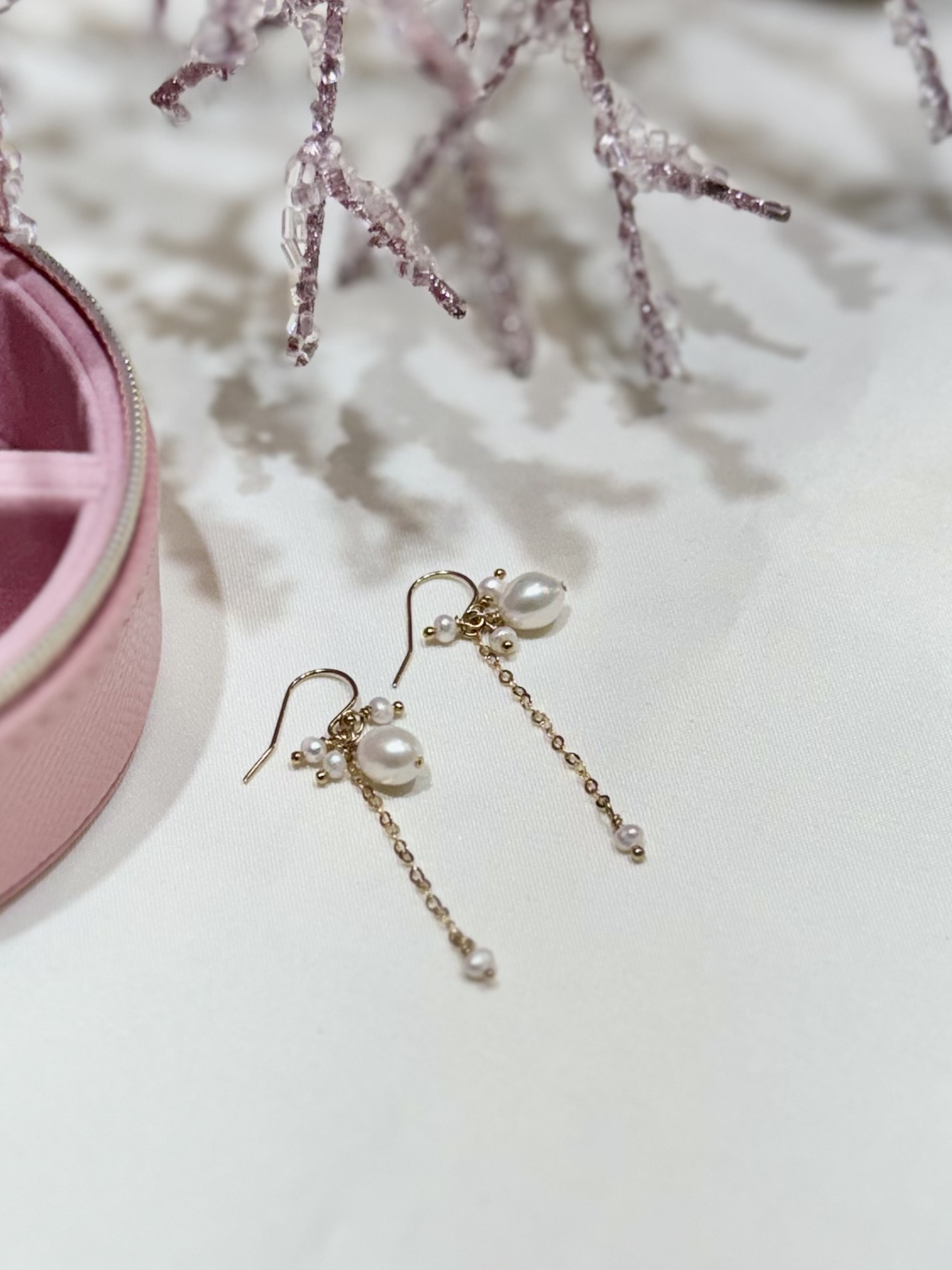 These handmade 14K gold filled earrings feature elegant raindrop shaped pearls, accented with tiny pearls that add a soft, timeless shimmer. Each pair is crafted to move beautifully. Delicate, graceful, and full of that effortless glow pearls are loved for.