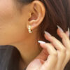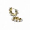 Bright & shiny, bold & beautiful! These divine huggie style earrings look great with everything in your closet. Fashioned in sterling silver with 14k gold, each earring showcases a row of lustrous 3mm ball-shaped freshwater pearls curving around the entire hoop to ensure shimmer from every angle. Polished to a bright shine, these earrings are secured with an easy back snap.