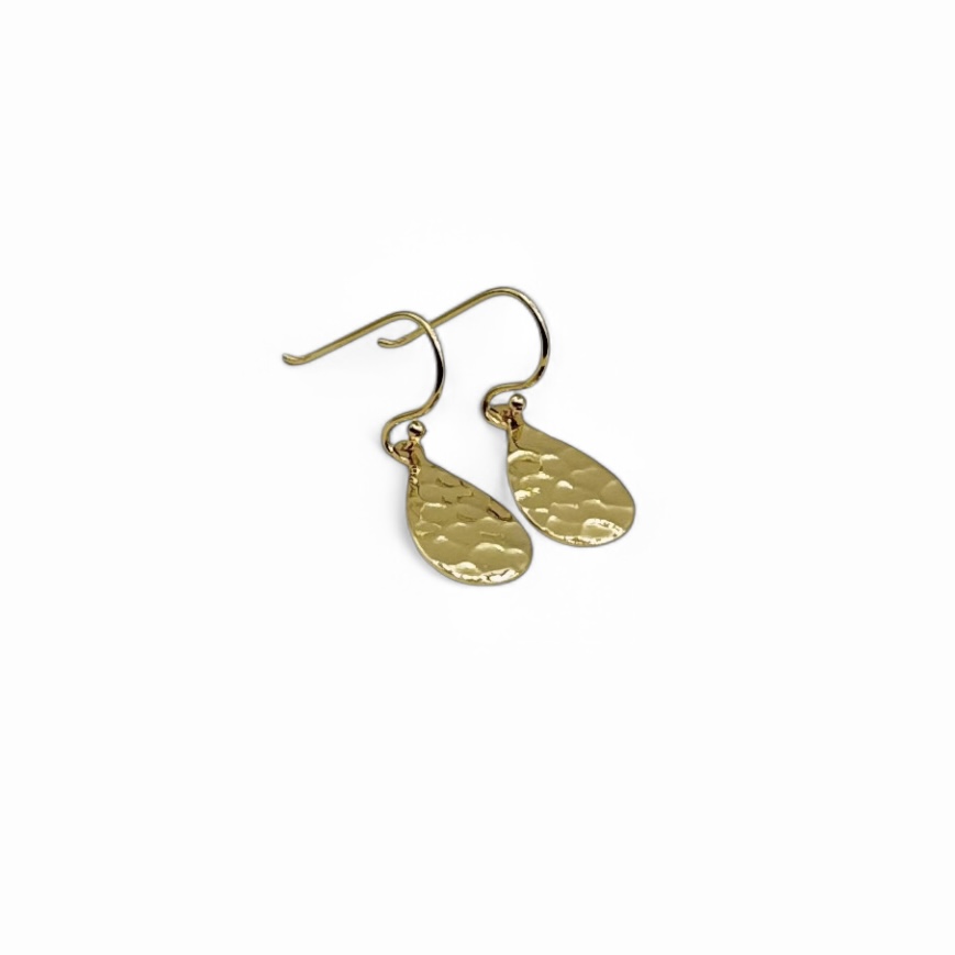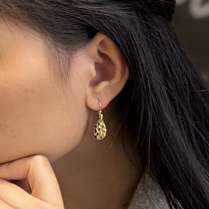 Elevate your everyday look with these elegant raindrop shaped dangle earrings, crafted from sterling silver and finished in a rich 14K gold plating. The gently hammered texture catches the light with every movement, adding a warm, organic shimmer. Lightweight and fluid, the design sways effortlessly, bringing a touch of golden glow and modern charm to any outfit. Perfect for adding just the right amount of statement day or night.