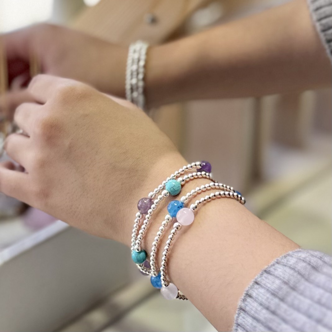 This elegant sterling silver stretch bracelet features a delicate string of polished silver beads, perfectly accented with a mix of vibrant, round gemstone beads. The colorful stones include soft rose quartz, deep amethyst, turquoise, and vivid blue chalcedony adding a playful yet sophisticated pop of color. The stretchy design ensures a comfortable, flexible fit, making it perfect for everyday wear or stacking with other bracelets for a layered look. A versatile and stylish piece that brings both shimmer and charm to your jewellery collection.