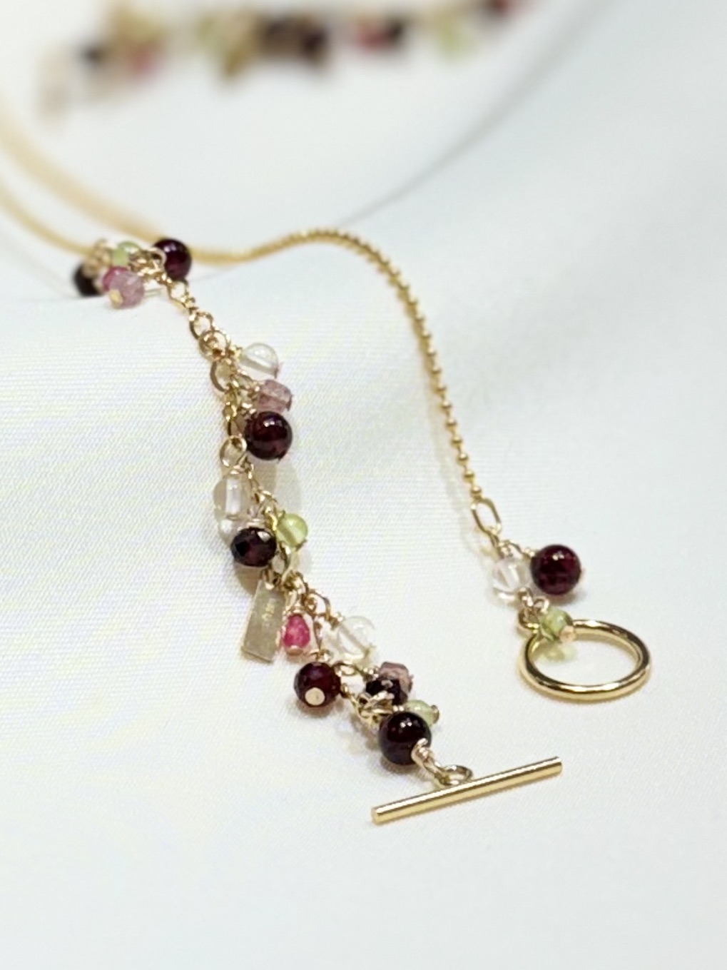 Awash in color and quiet luxury, this handmade 14K gold filled toggle necklace is beautifully ornamented with a curated mix of gemstones deep wine red garnet, fresh green peridot, icy crystal accents, and a delicate hint of cherry rose quartz beads. Each stone is thoughtfully placed to create a balanced, luminous look that feels both organic and refined.